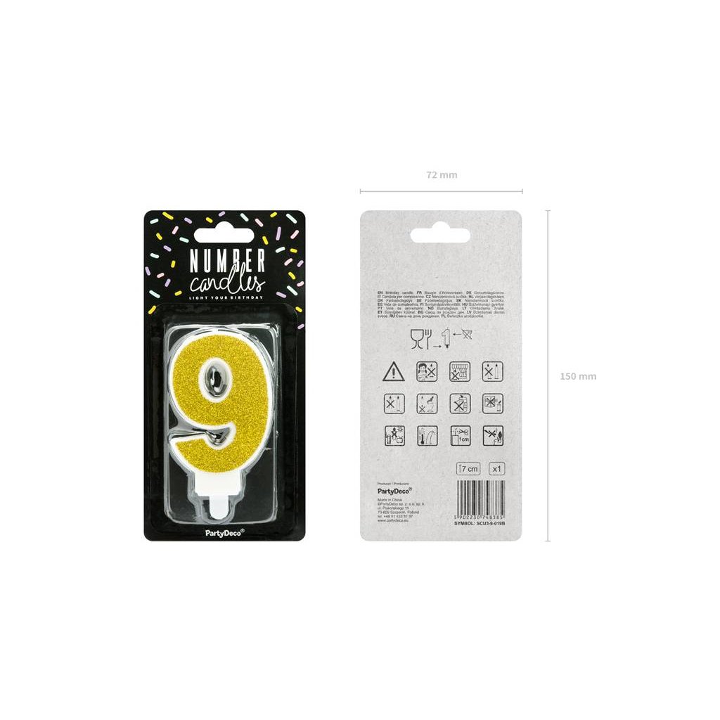 PARTY DECO Svíčka číslice "9" 7 cm zlatá 1 ks
