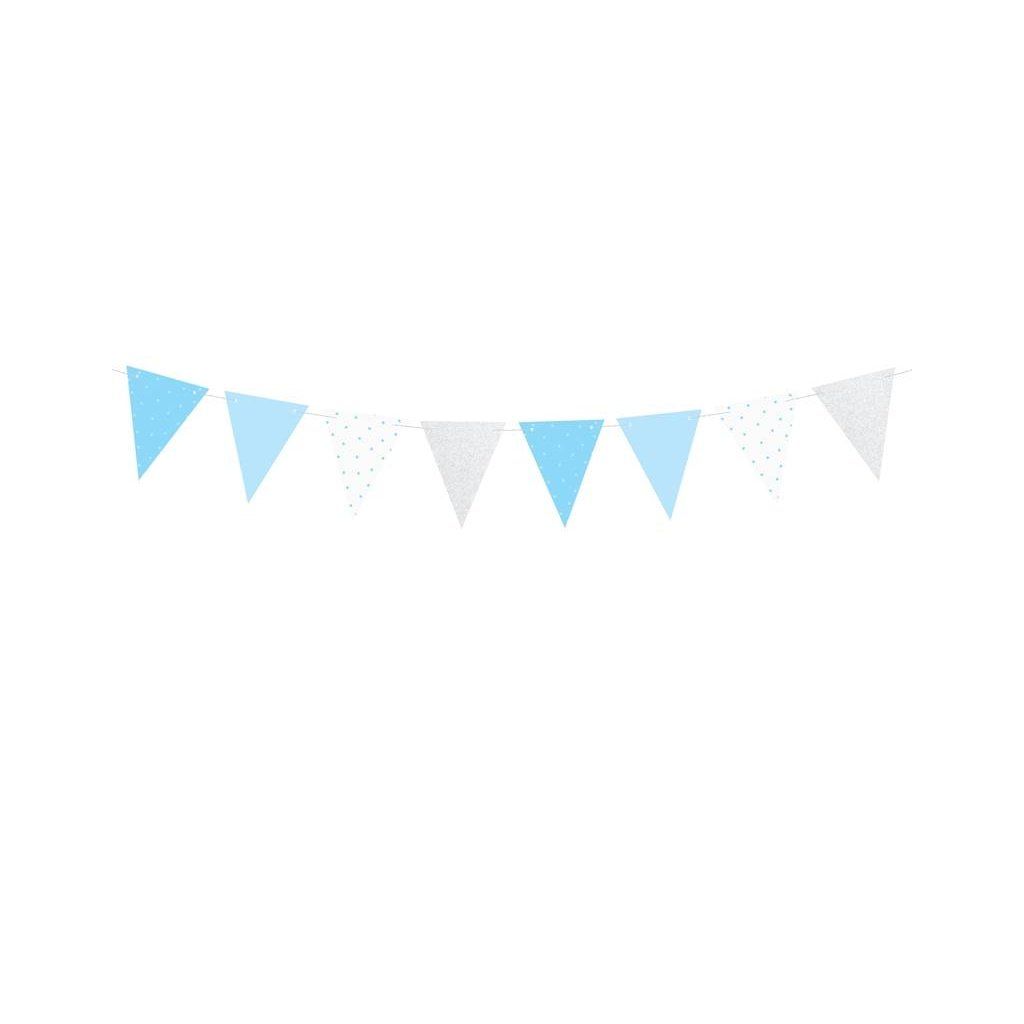 PartyDeco girlanda s modrými, bílými a stříbrnými praporky ▹