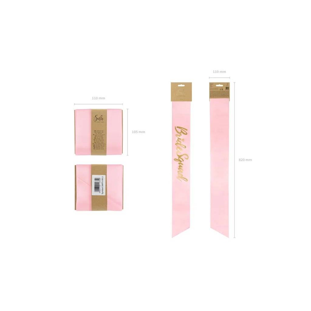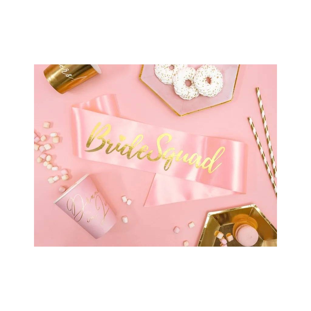PartyDeco Saténová šerpa růžová se zlatým nápisem Bride Squad 75 cm ▹