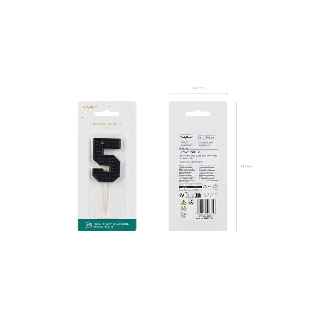 PartyDeco svíčka černá na špejli číslo 5 ▹