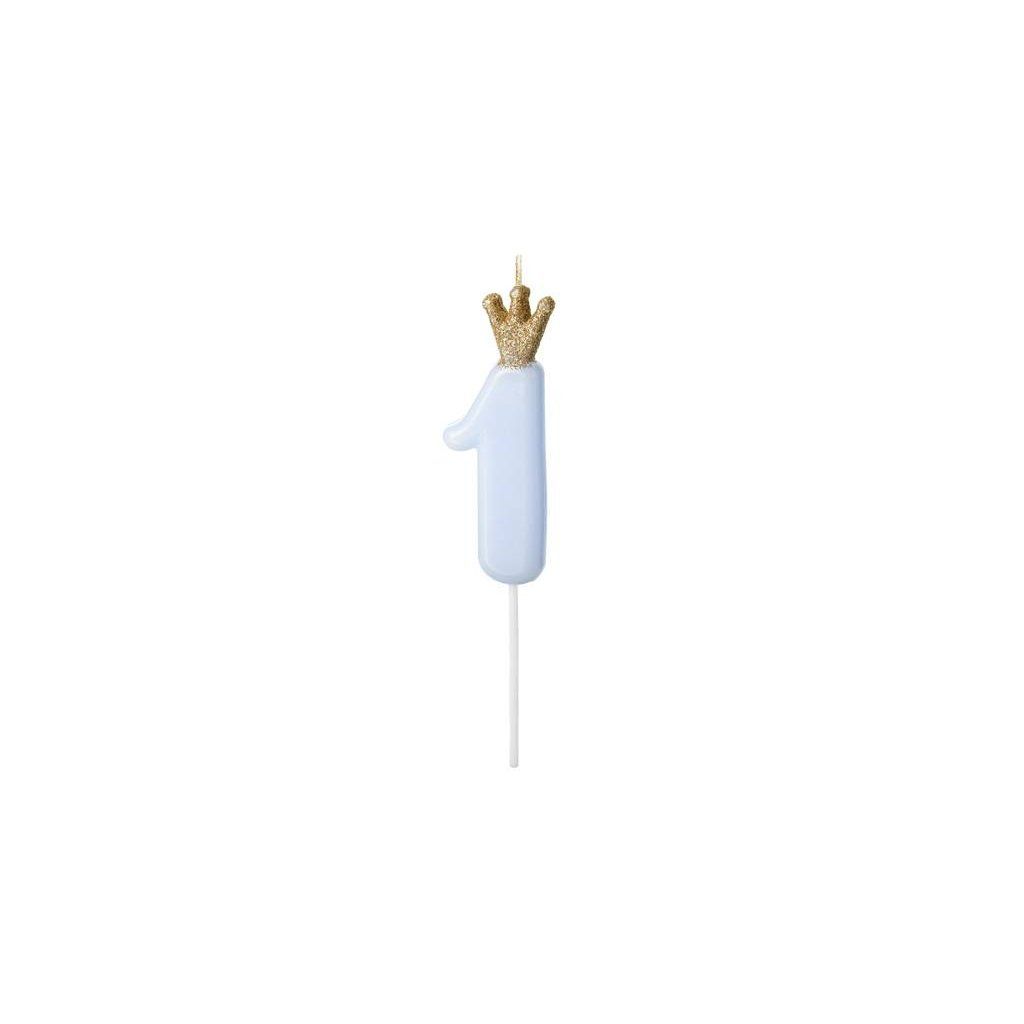 PartyDeco svíčka malá modrá s korunkou číslo 1 ▹ /BP