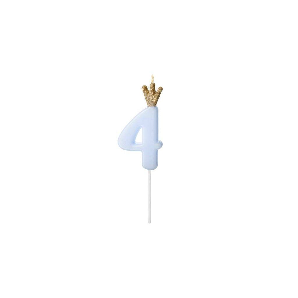 PartyDeco svíčka malá modrá s korunkou číslo 4 ▹