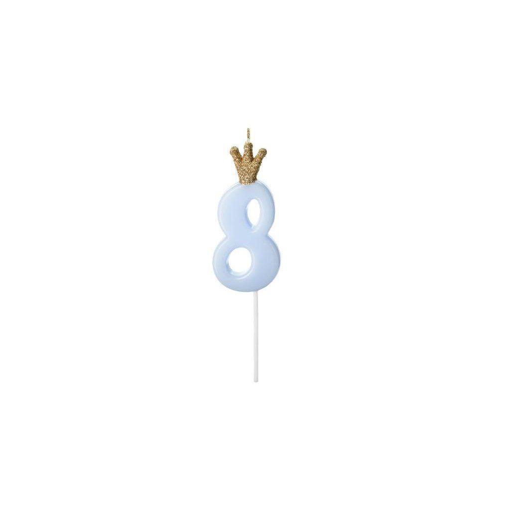 PartyDeco svíčka malá modrá s korunkou číslo 8 ▹