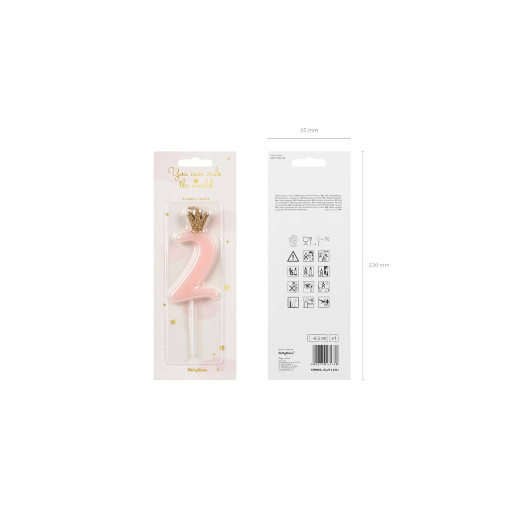 PartyDeco svíčka malá růžová s korunkou číslo 2 ▹