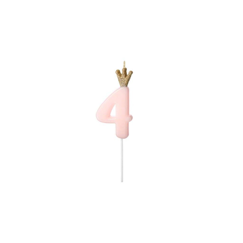 PartyDeco svíčka malá růžová s korunkou číslo 4 ▹