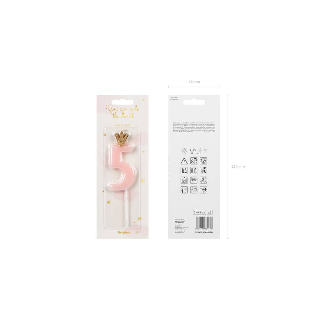 PartyDeco svíčka malá růžová s korunkou číslo 5 ▹