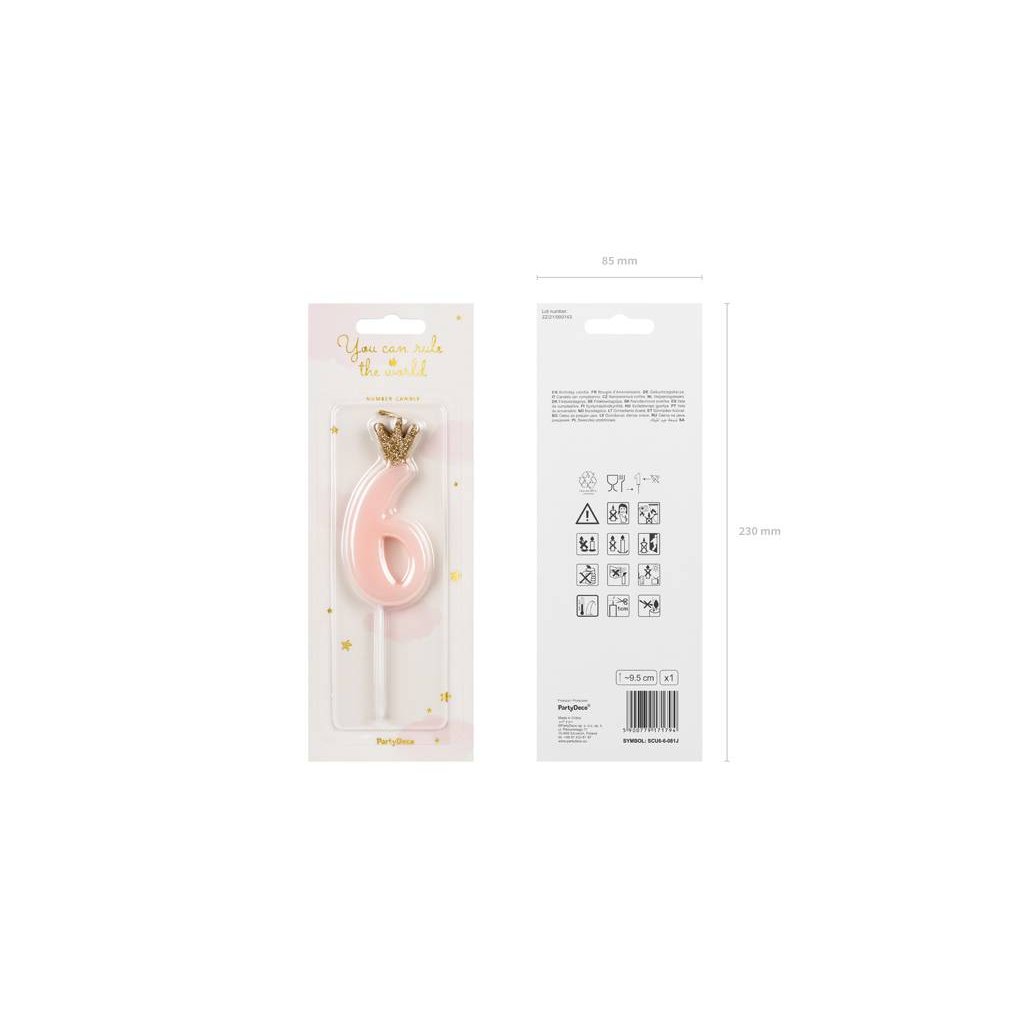 PartyDeco svíčka malá růžová s korunkou číslo 6 ▹