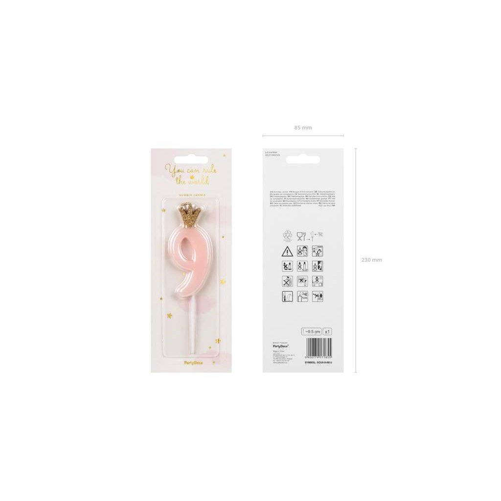 PartyDeco svíčka malá růžová s korunkou číslo 9 ▹