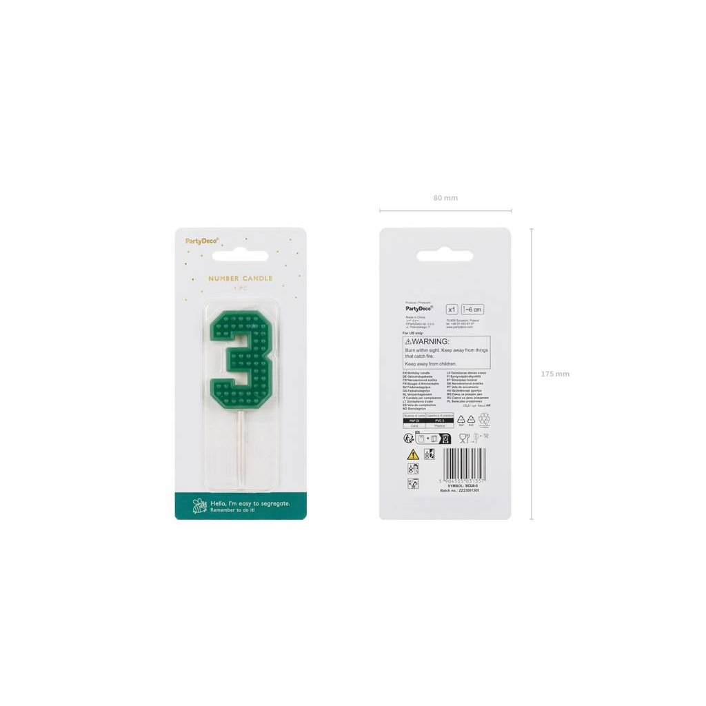 PartyDeco svíčka zelená na špejli číslo 3 ▹