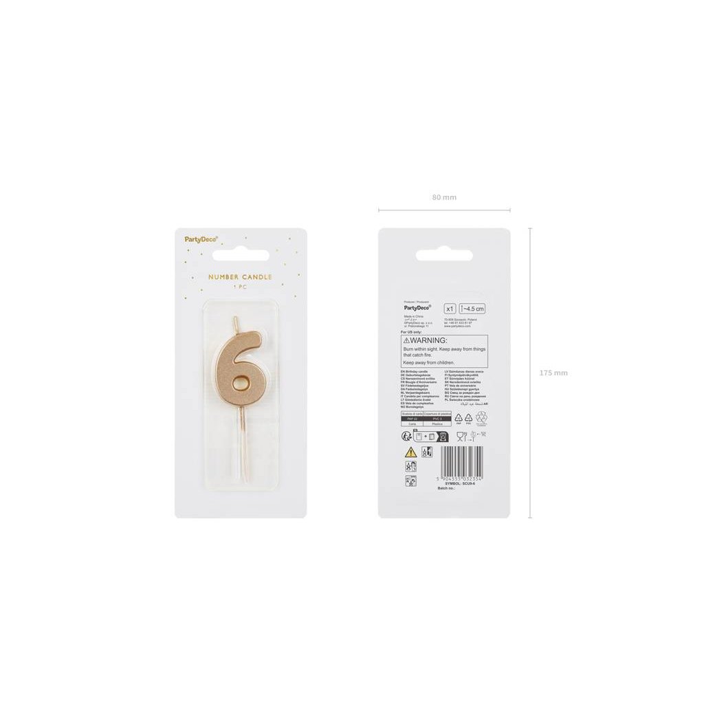 PartyDeco svíčka zlatá na špejli číslo 6 ▹