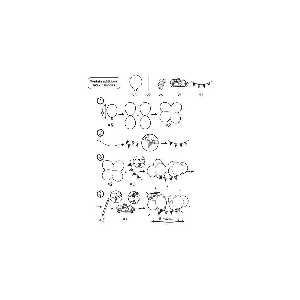 Výška dekorace: cca 29 cm Sada obsahuje: 10 balónků (8 cm), 1 papírové auto, 4 papírové praporky, 2 zapichovací tyčky, 40 cm provázek a 6 kusů lepenky.Doplňkové parametry