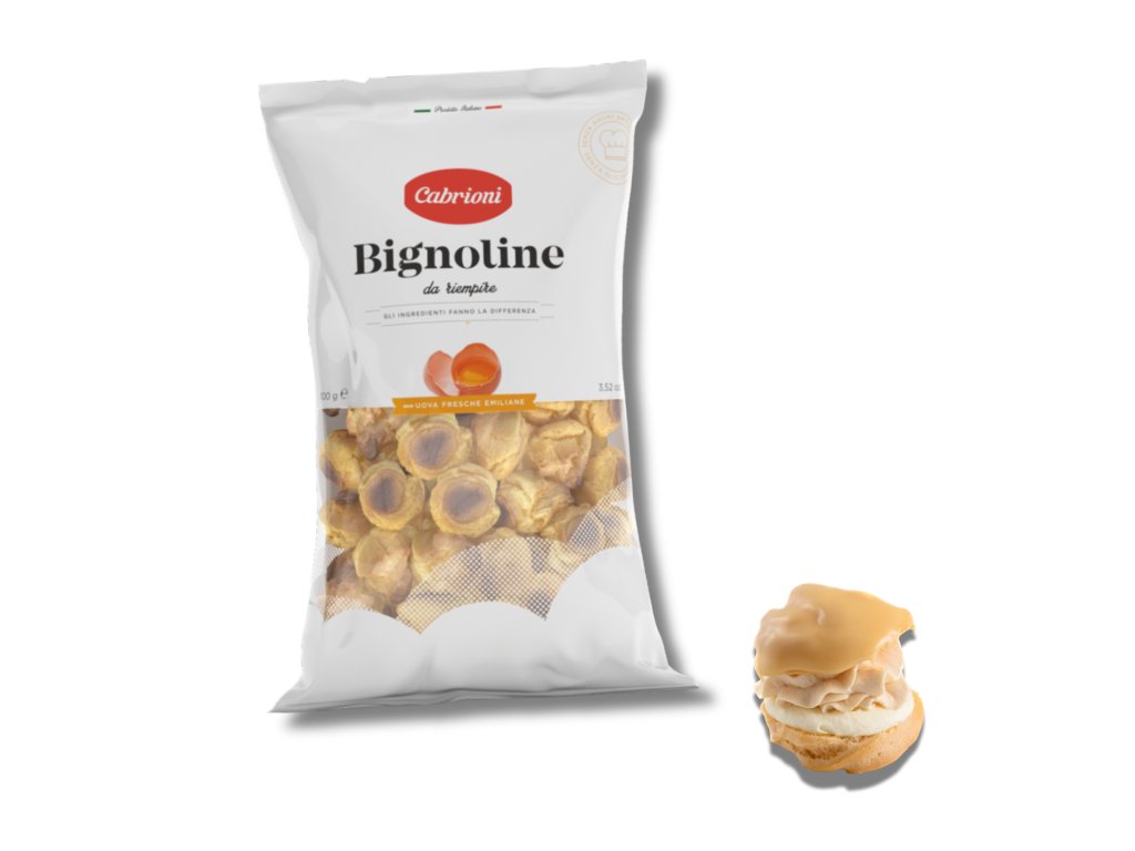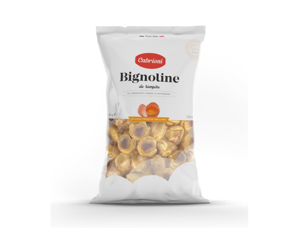 Bignoline jsou malé větrníčky vyrobené z odpalovaného těsta s použítím čerstvých vajec z regionu Reggio Emilia připravené k okamžitému plnění sladkou nebo slanou náplní. Větrníčky jsou po naplnění úžasně vláčné, každé sousto je tak úplným balzámem pro Vaše mlsné jazýčky. Věříme, že si jistě najdou svoje místo i ve Vaší kuchyni a pokud popustíte uzdu fantazii, vzniknou tradiční i netradiční sladké vetrníčky nebo celá spousta slaných variací.