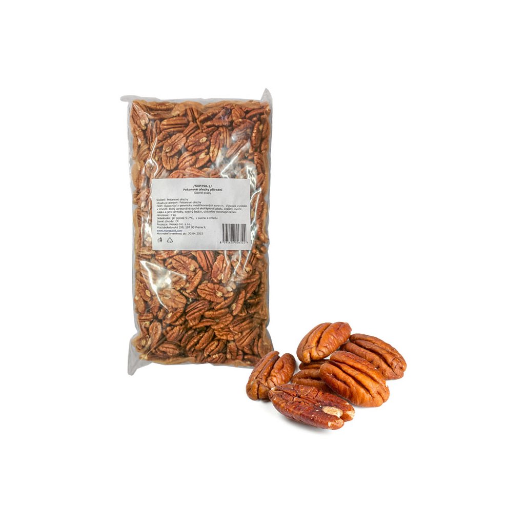 Vyloupaná jádra pekanových ořechů (natural) neblanšírovaná. Pekanové ořechy se stejně jako jiné ořechy hodí do kaší, jogurtů, pudinků, pečiva, dezertů, ale s oblibou se konzumují jen tak třeba u knížky, či televize.