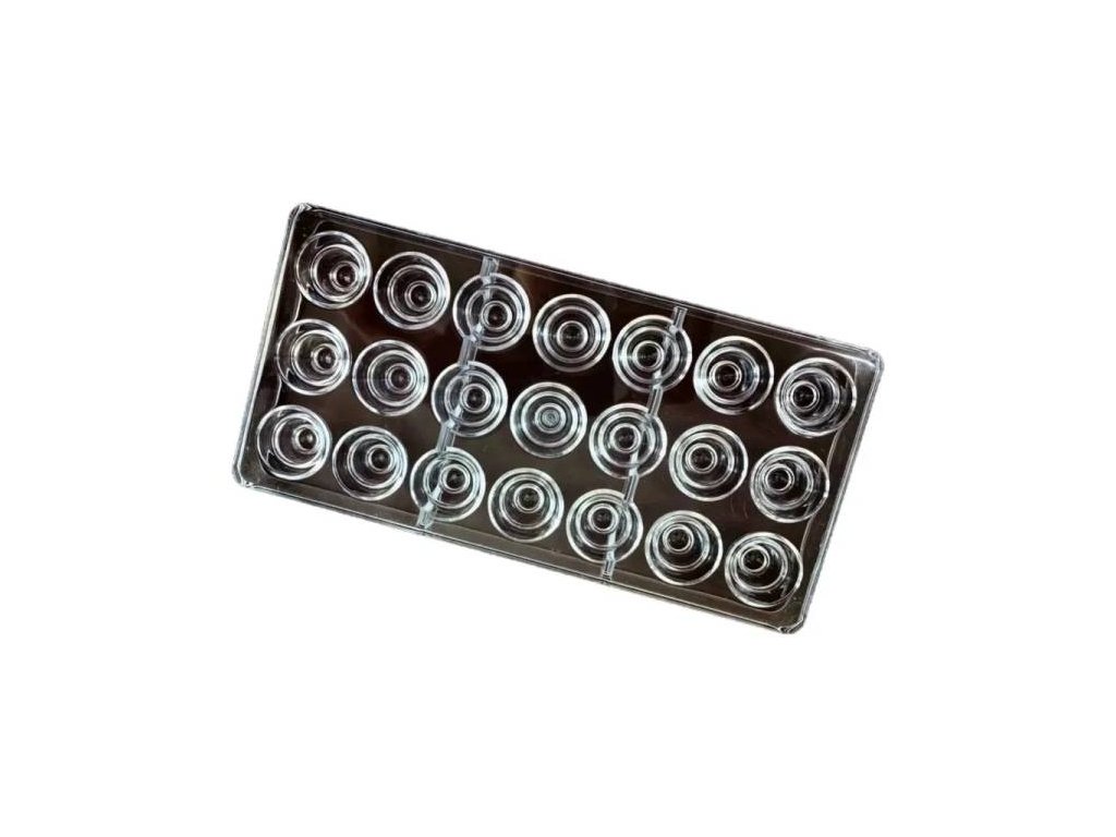 Rozměr formy: 27,5 x 13,5 x 2,4 cm Rozměr pralinky: 3 cm Materiál: plast Výroba čokoládových bonbonů je velice jednoduchá. Při výrobě plných čokolád nalijeme do formy čokoládovou hmotu, povrch srovnáme cukrářskou kartou a necháme ztuhnout. Pokud chceme vyrábět plněné bonbony, musíme nejdříve vyrobit tzv. skořápku, to představuje nanesení čokolády na boky tvarovné formy, dáme do mrazáku podchladit a pokud je vrstva tenčí, naneseme vrstvu druhou. Do vytvořené skořepiny vkládáme požadovanou náplň - marcipán, alkoholové náplně, oříškové nebo karamelové. Záleží jen na naší fantazii a chuti. Při plnění skořepiny nezapomeneme na ponechání prostoru na zavíčkování bonbonu – tj. zalití náplně další vrstvičkou čokolády. Formu opět vkládáme do chladu a po vytuhnutí vyklepneme.Doplňkové parametry