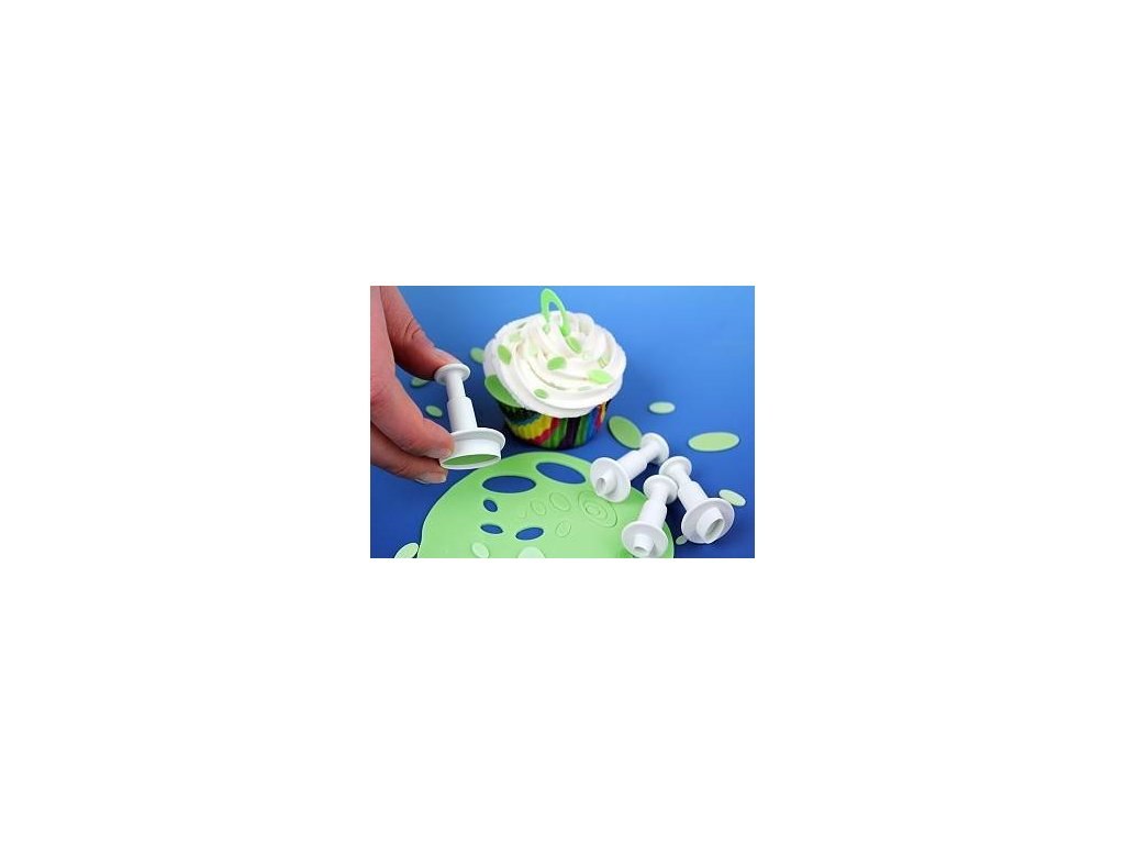Materiál: plastRozměry: 0,6 cm, 1 cm, 1,3 cm a 2,4 cmVykrajovátko přiložíme na vyválenou hmotu. Příslušný tvar vykrojíme bez stlačování pístu, tudíž jen přitlačením obvodu vykrajovátka. Vykrojený tvar nám zůstane uvnitř. Nyní pomocí pístu hmotu vytlačíme ven. Lze tak dekorovat dort přiložením vykrajovátka přímo na něj a pak následným stlačením pístu.Doplňkové parametry