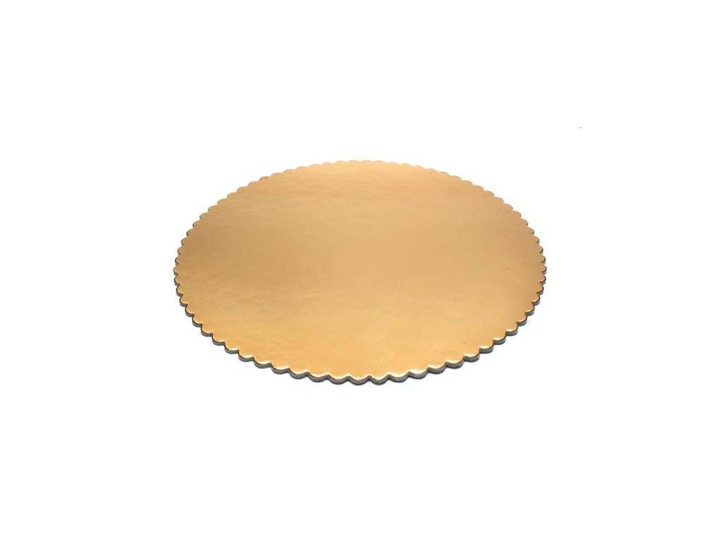 Velmi kvalitní nepřemastitelná, lepenková, kruhová podložka s vlnkový okrajem pod dorty a jiné cukrářské výrobky laminovaná zlatou fólií. Tvrdost: 2000 Průměr: 36 cm