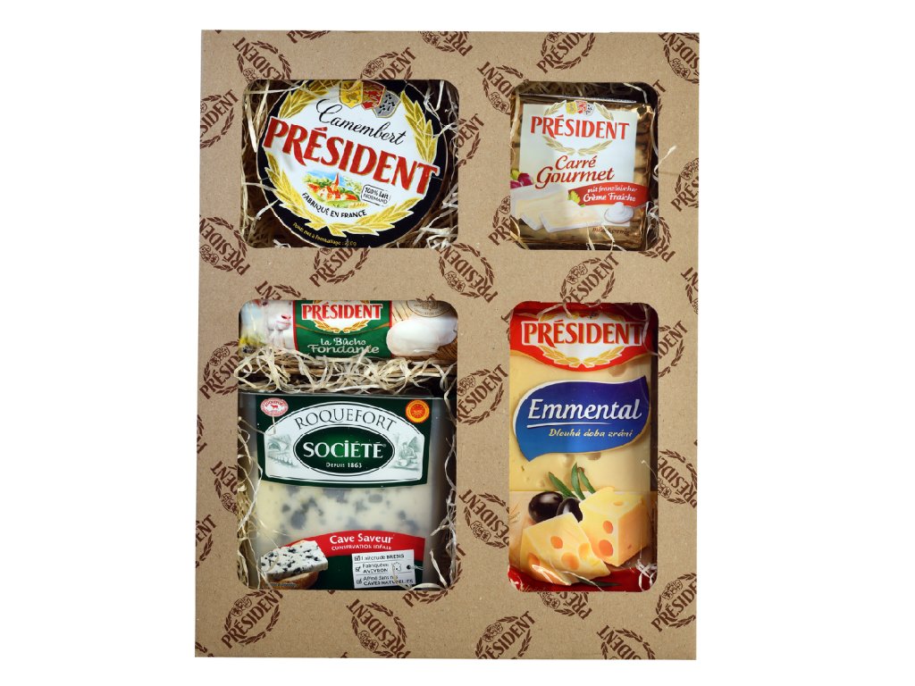 - PRÉSIDENT Camembert Měkký zrající sýr s bílou plísní na povrchu. Složení: MLÉKO, jedlá sůl, sýrařské kultury, mikrobiální syřidlo. // La Buche Fondante Zrající kozí sýr s bílou plísní na povrchu. Složení: pasterované kozí MLÉKO, jedlá sůl, sýrařské kultury, mikrobiální syřidlo. // La Brique Měkký zrající sýr s bílou plísní na povrchu. Složení: pasterované MLÉKO, jedlá sůl, sýrařské kultury, živočišné syřidlo. // Emmental bloček Porcovaný tvrdý sýr. Složení: MLÉKO, jedlá sůl, mléčné kultury, barvivo beta karoten. // SOCIETE Roquefort Zrající sýr s modrou plísní zrající v celé hmotě, plnotučný. Složení: nepasterované ovčí MLÉKO, jedlá sůl, sýrařské kultury, živočišné syřidlo, ušlechtilá plíseň Penicillium roqueforti.