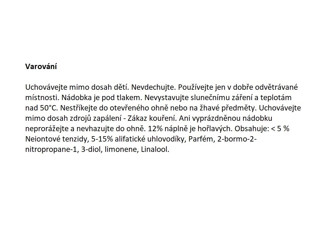 | Upozornění o hořlavosti a toxických chemických látkách: | Varování: vždy si prostudujte popisnou etiketu obalu, všechny námi nabízené výrobky jsou opatřeny českým popisem |