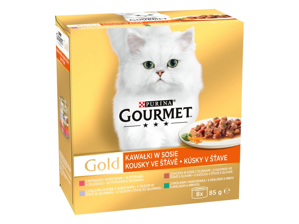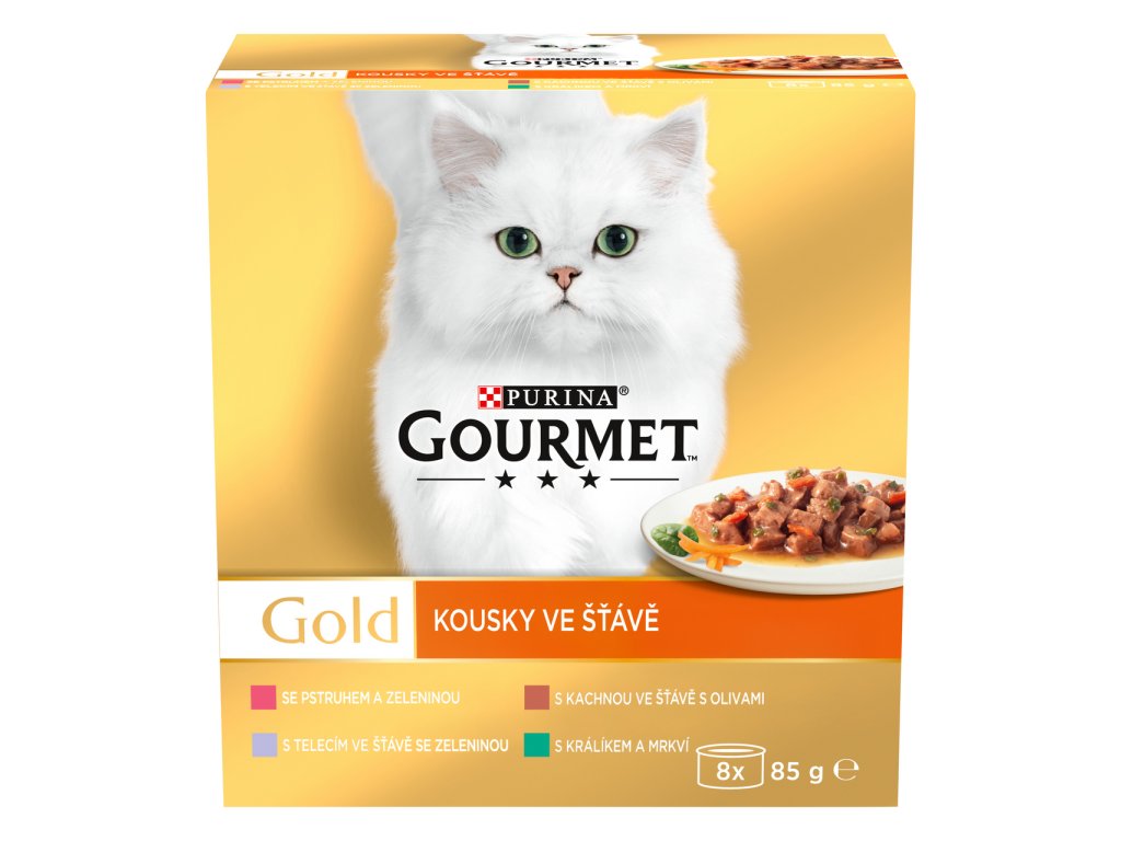 - GOURMET GOLD kousky s kachnou ve šťávě s olivami, s telecím ve šťávě se zeleninou, s králíkem a mrkv ve šťávě, se pstruhem a zeleninou ve šťávě