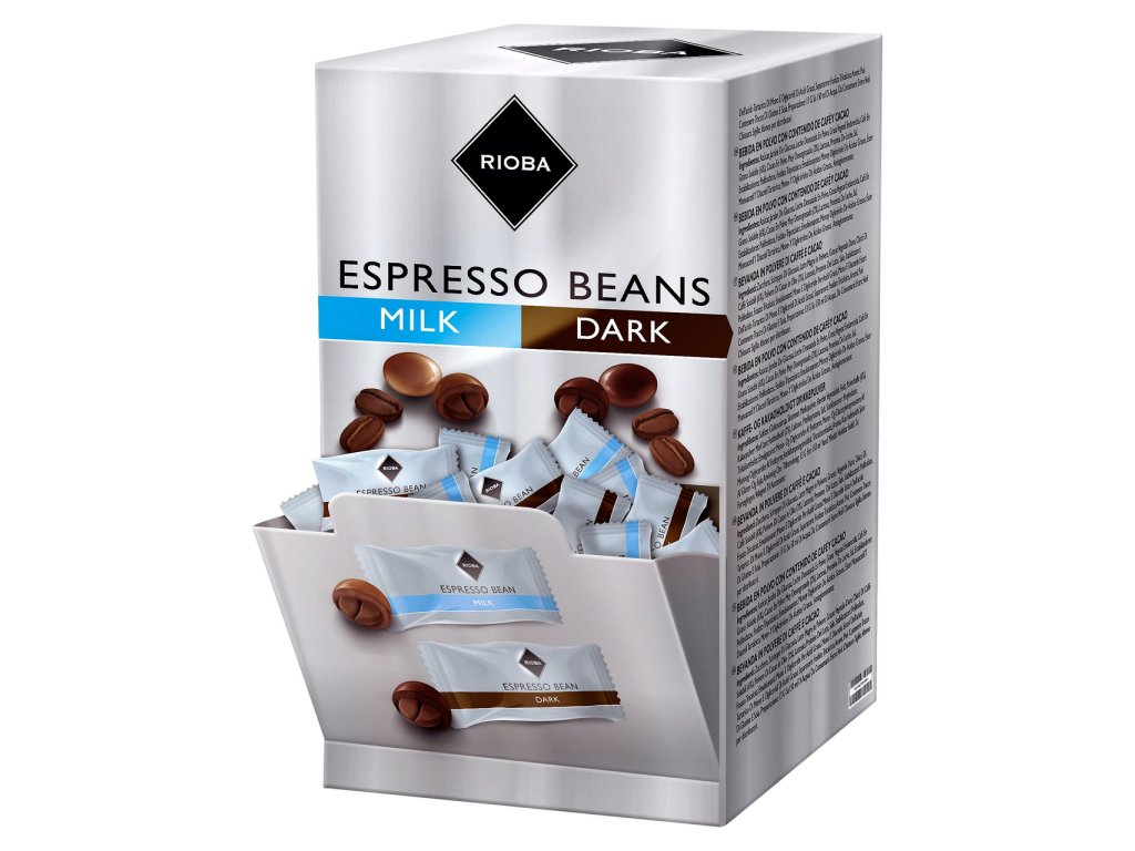 - Espresso kávová zrna v mléčné čokoládě a hořké čokoládě. Espresso kávová zrna v mléčné čokoládě (82%).