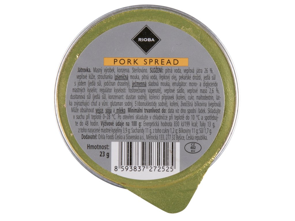 NUTRIČNÍ HODNOTY produktu - RIOBA Pomazánka játrová 24 x 23 g / 100g výrobku
