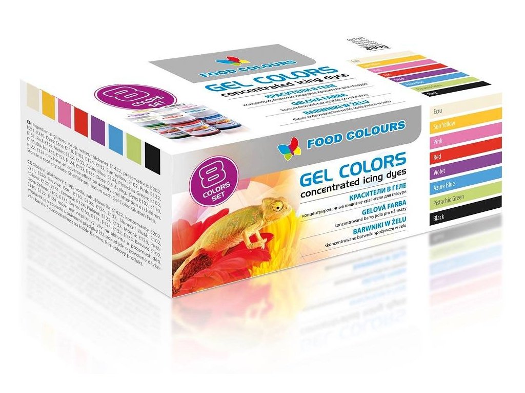 Balení osmy odstínů gelových barev: zářivě žlutá, pistáciově zelená, červená, růžová, fialová, azurově modrá, světle oranžová, černá. Hmotnost 280g.