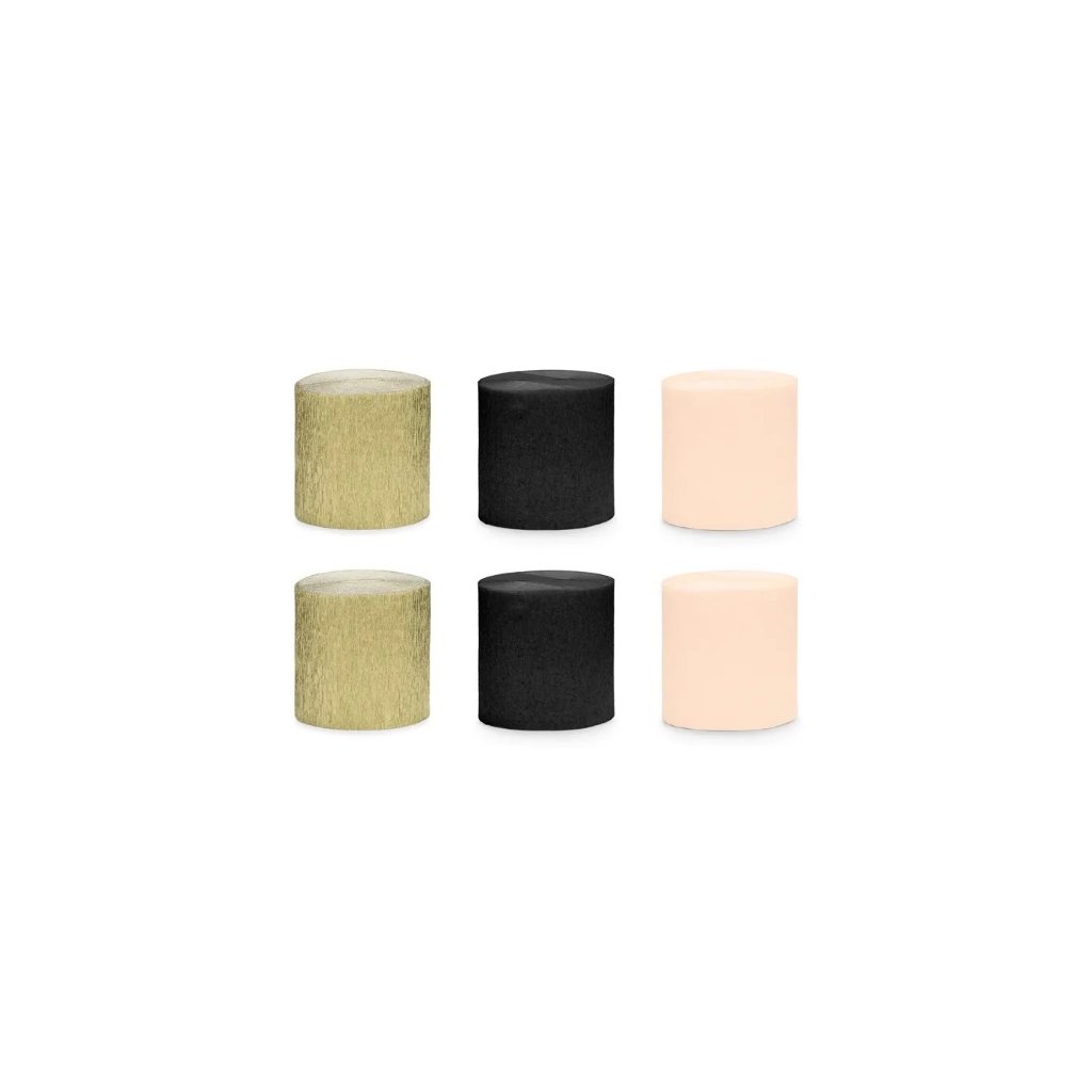 Sada krepových stuh - zlato černá 5 cm x 10 m. Papírové stuhy na výrobu mašlí a různých dekorací. Lze je použít například na svatbě, oslavě narozenin, křtinách při různém dekorování nebo jako stuhu na dárek či kytici. Stuhy lze také kombinovat jako netradiční svatební výzdoba sváteční tabule. Velikost: 5 cm x 10 m Material: papír Balení: 1 ks.Doplňkové parametry