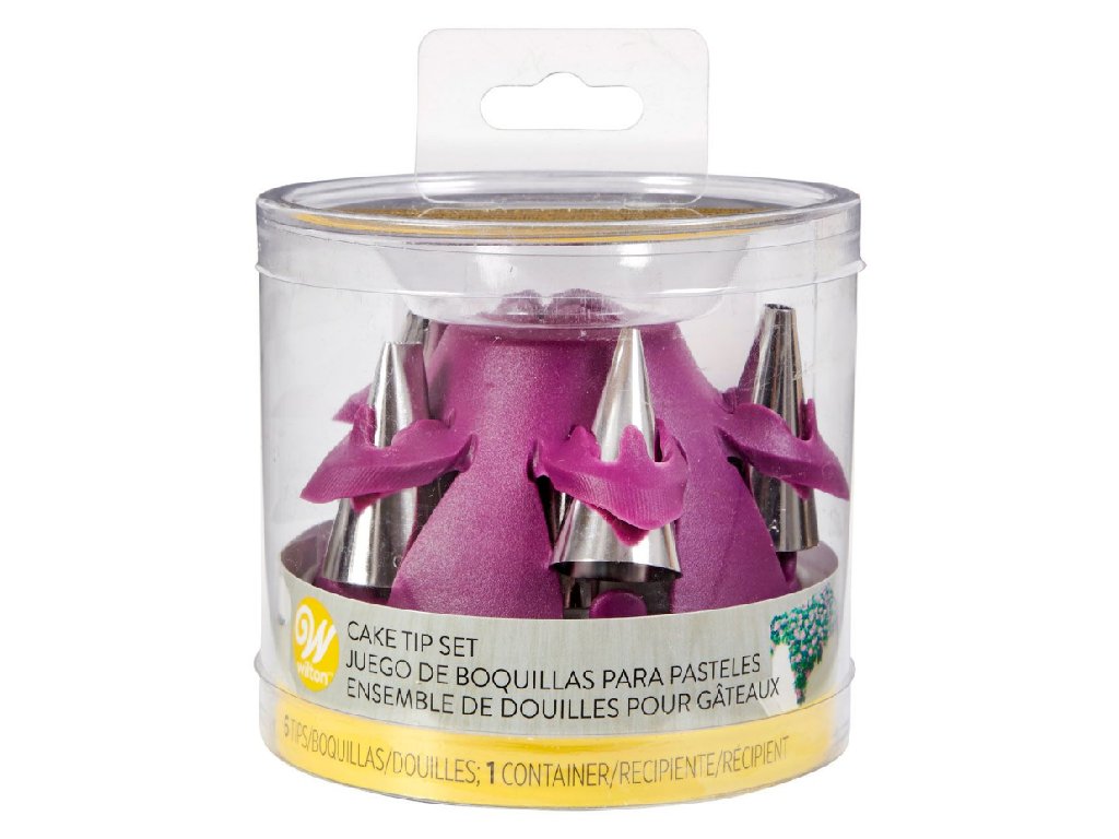 Držák Wilton vám umožní snadné uložení špiček v krabici. A na této sadě je skvělé, že můžete krabičku včetně hrotů umístit do myčky na čištění. Sada obsahuje 5 špiček pravidelné velikosti a 1 špičku velké velikosti pro zdobení dortů. Po zdobení vložte všechny tipy zpět do úložné krabice a vložte je do myčky.