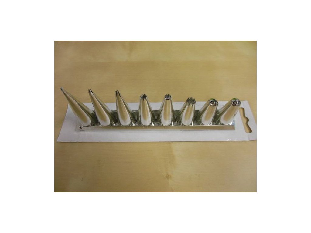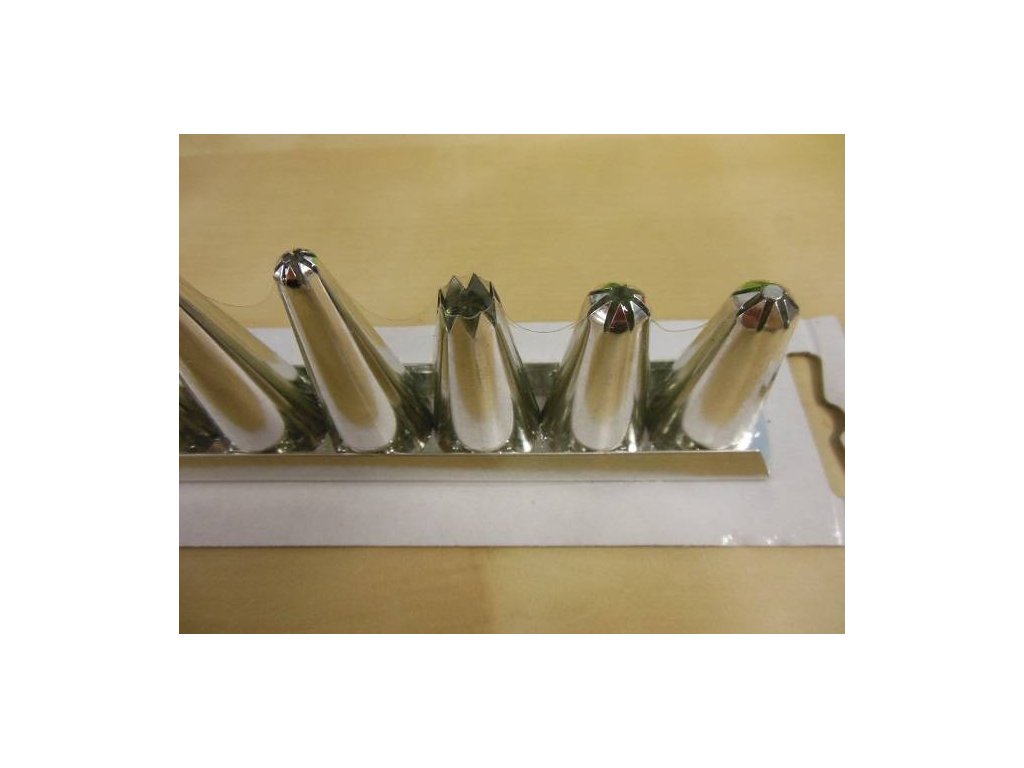 Materiál: pocínovaný potravinářský plechŠpičky (zleva):- špička č. 1 psací (průměr 1 mm)- špička č. 2 jemná (průměr 3 mm, 5 zubů),- špička č. 3 jemná točená (průměr 3 mm, 5 zubů)- špička č. 4 (průměr 6 mm, 8 zubů)- špička č. 5 klopená (průměr 6 mm, 8 zubů- špička č. 6 (průměr 8 mm, 8 zubů)- špička č. 7 klopená (průměr 8 mm, 8 zubů)- špička č. 8 klopená se středem (průměr 8 mm, 8 zubů)Doplňkové parametry