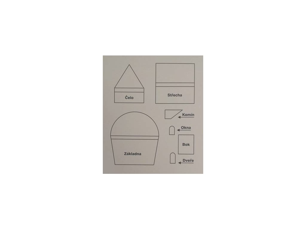 Materiál: pocínovaný potravinářský plechRozměry: základna 9 x 10 cm, přední a zadní strana 5,5 x 7 cm, střecha 7 x 7,5 cm, komín 2 x 3,3 cm, bok 3 x 3,8 cm, okno 0,9 x 1,5 cm a dveře 0,9 x 2 cmDoplňkové parametry