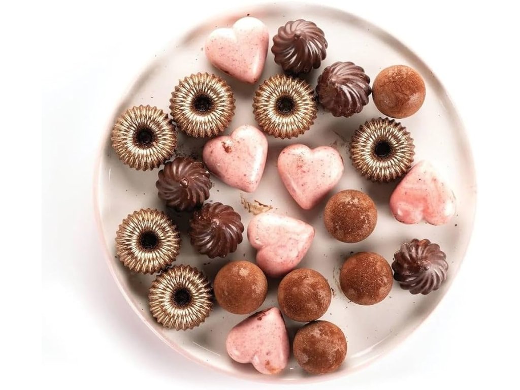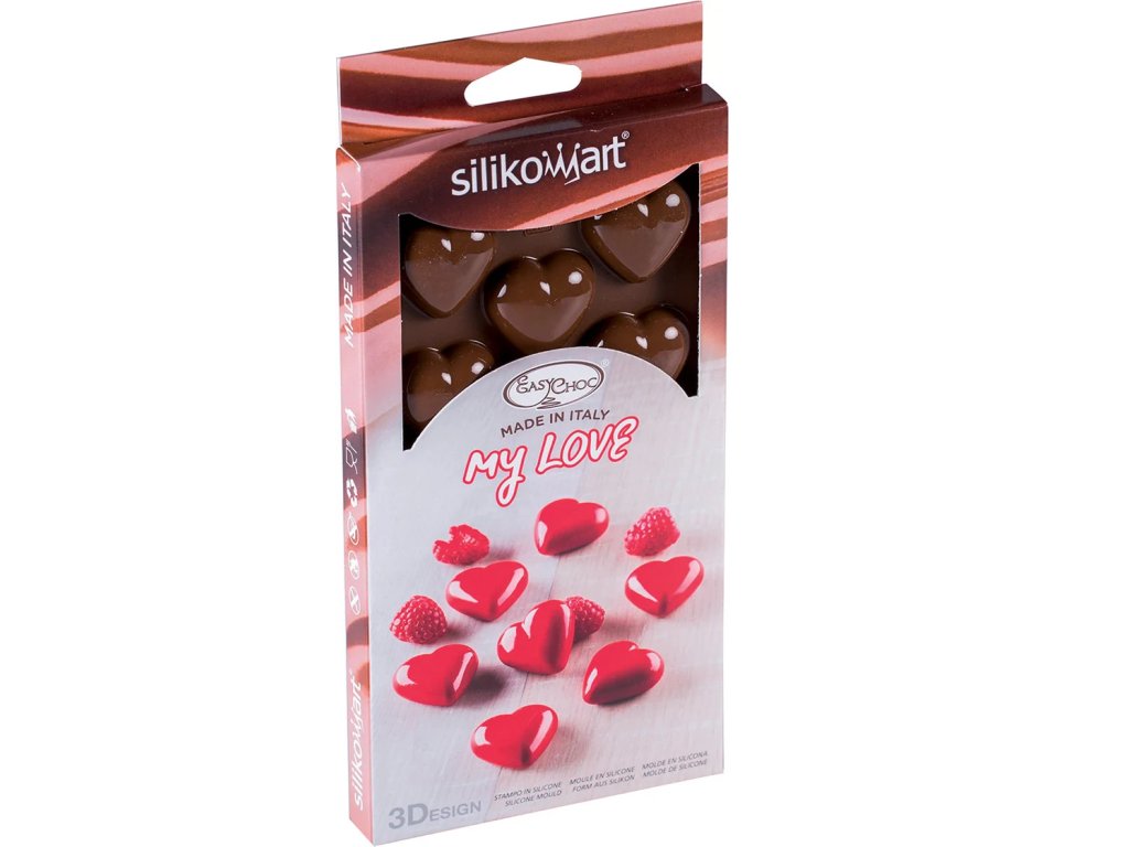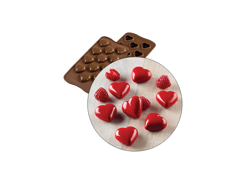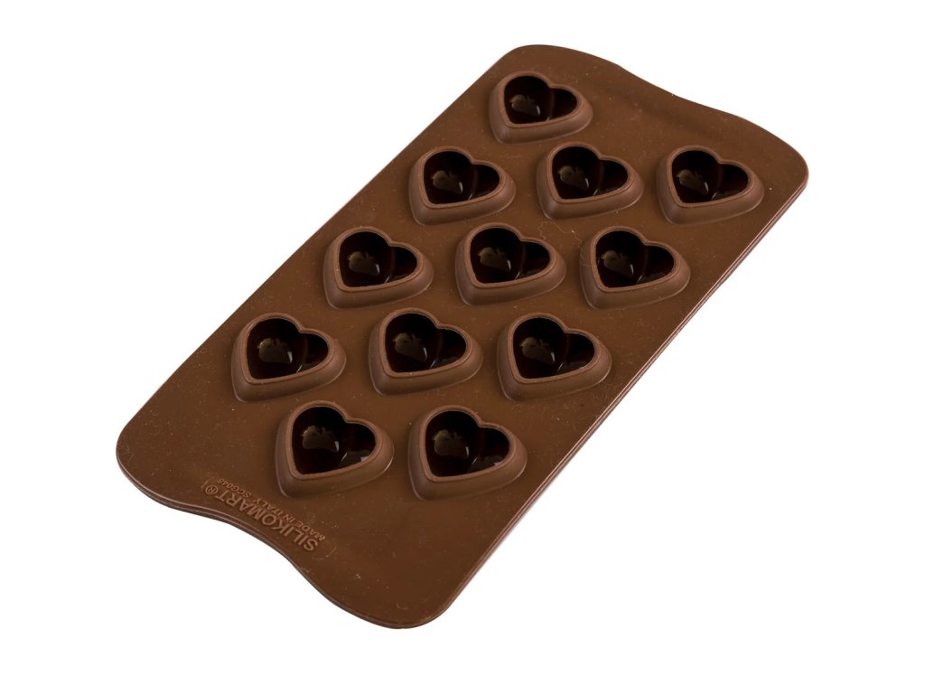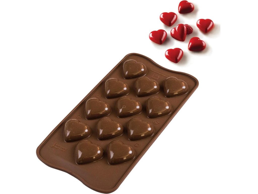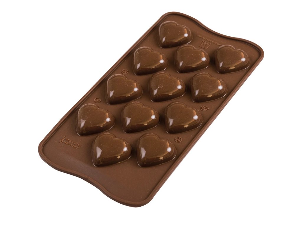 Kvalitní silikonová forma na výrobu čokoládových pralinek. Rozměr formy: cca 21 x 10 cm Rozměr jednoho srdíčka: 3,1 x 3 x 1,5 cm Objem jednoho srdíčka: 8 ml Použití: Do formy nalijte rozpuštěnou čokoládu a nechte v lednici ztuhnout. Lze použít i na fondánovou hmotu, isomalt a želatinu.Doplňkové parametry