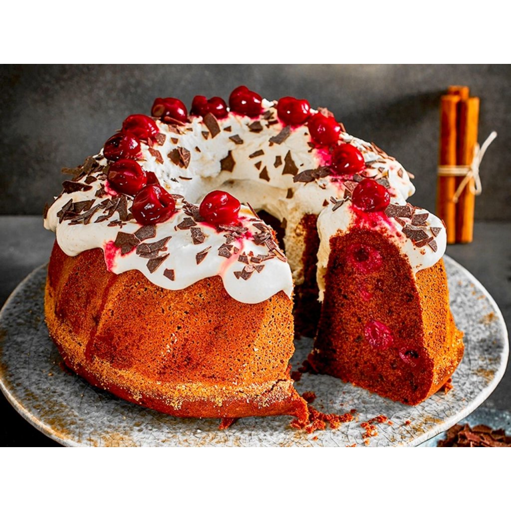 Připravte si krém: práškovou směs na krém ušlehejte se smetanou a mlékem. Krém neneste na vychladnutou bábovku a dekorujete višněmi a čokoládovou dekorací.