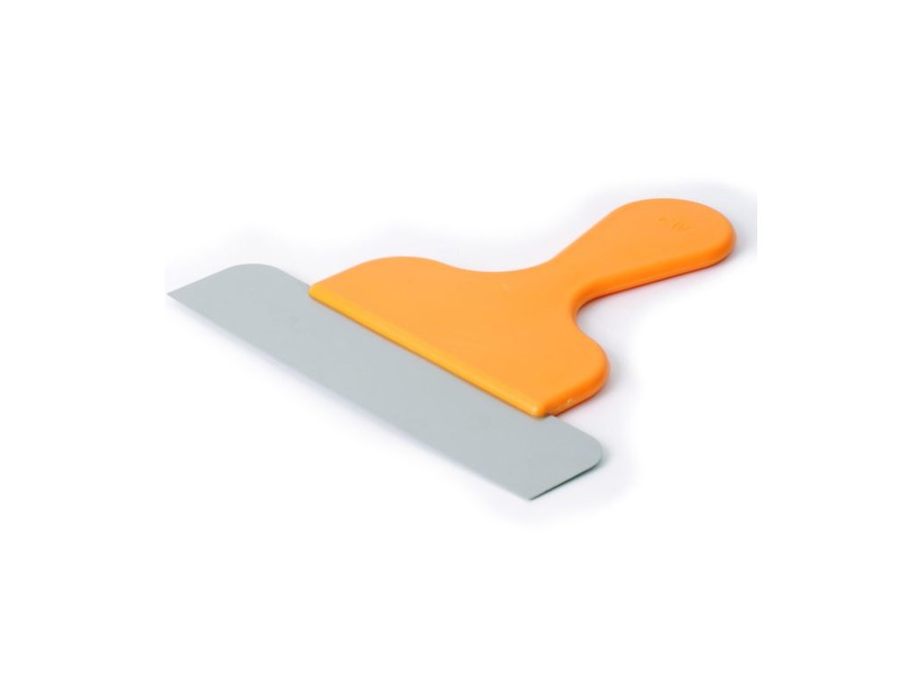 Nerezová špachtle s polypropylenovou rukojetí ideální na stírání čokolády z forem na pralinky o šířce 18-19 cm