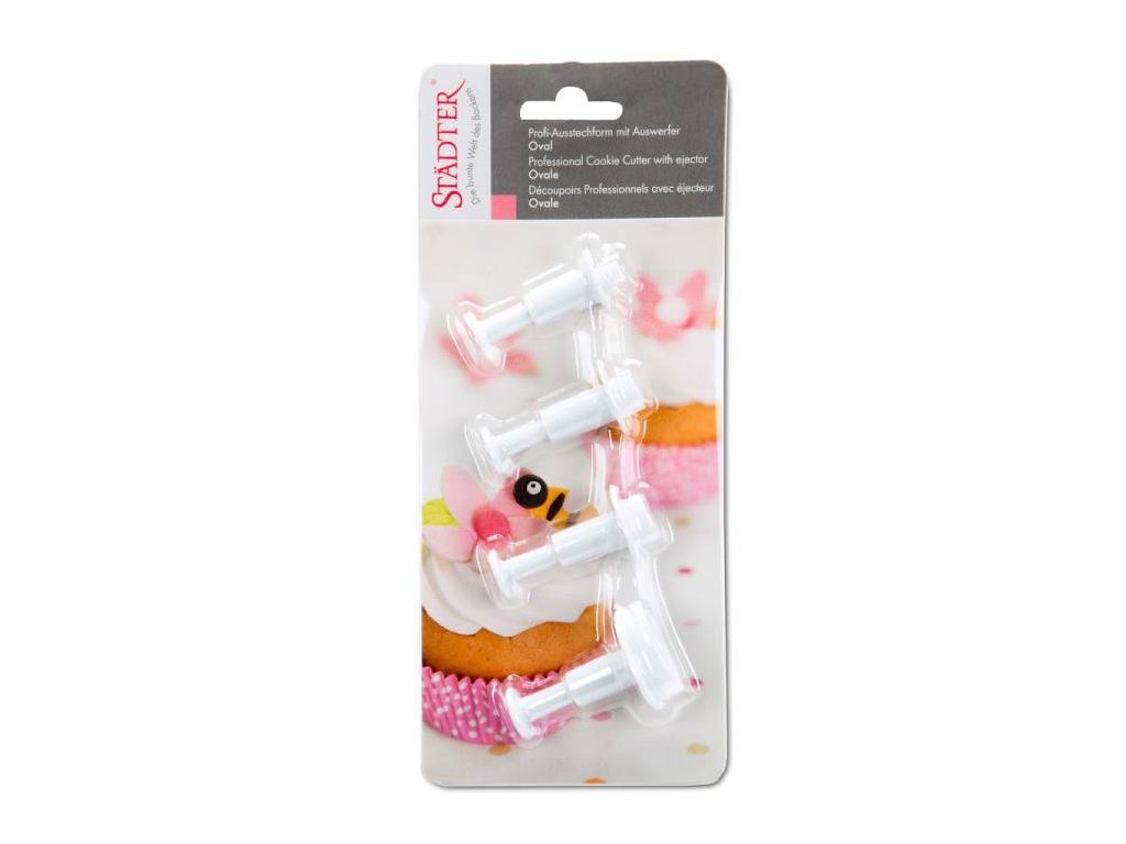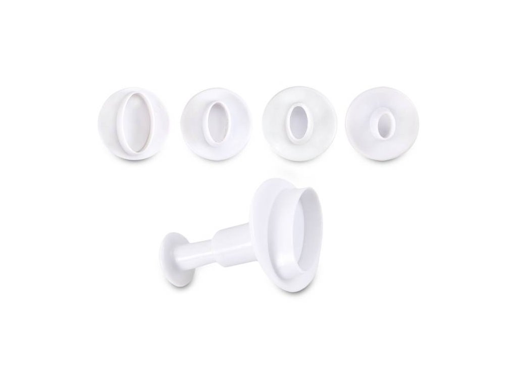 Materiál: plast Rozměry: 0,6 cm, 0,9 cm, 1,3 cm a 2,5 cm Vykrajovátko přiložíme na vyválenou hmotu. Příslušný tvar vykrojíme bez stlačování pístu, tudíž jen přitlačením obvodu vykrajovátka. Vykrojený tvar nám zůstane uvnitř. Nyní pomocí pístu hmotu vytlačíme ven.Doplňkové parametry