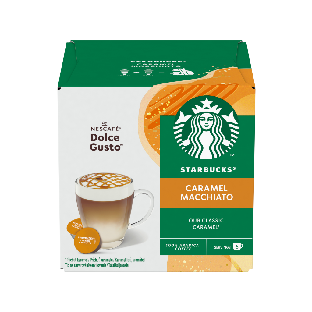 - Inspirováno vaší oblíbenou kávou Starbucks® Caramel Macchiato – oddejte se krémové blaženosti mléčné a karamelové chuti. Připravte si doma v kávovaru Nescafe® Dolce Gusto®.