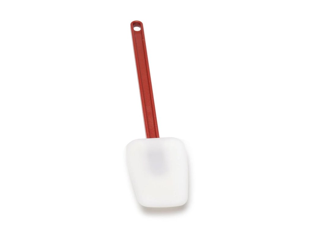 Silikonová stěrka ve tvaru lžíce s rukojetí a otvorem na zavěšení.
