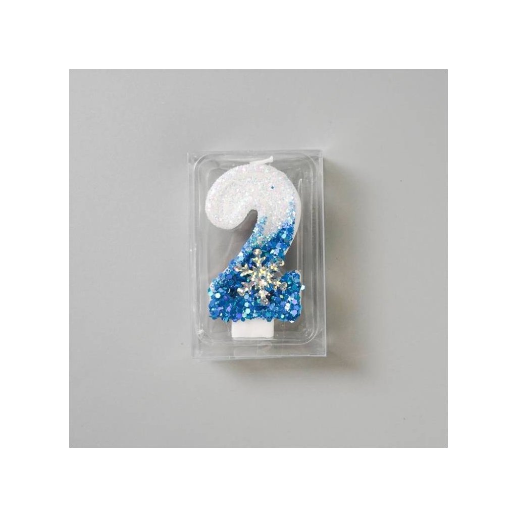 Svíčka bílo-modrá se sněhovou vločkou Frozen číslo 2 ▹