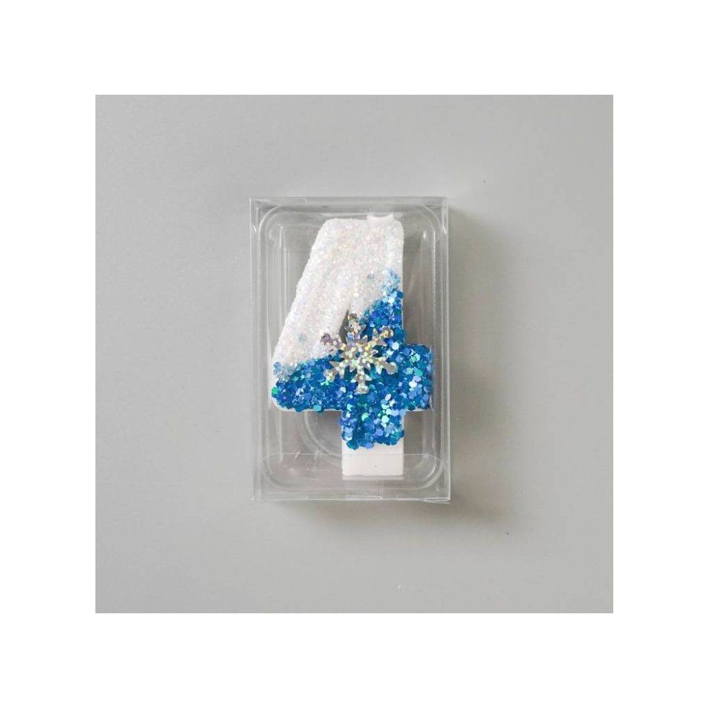 Svíčka Frozen bílo-modrá se sněhovou vločkou s číslem 4 ▹