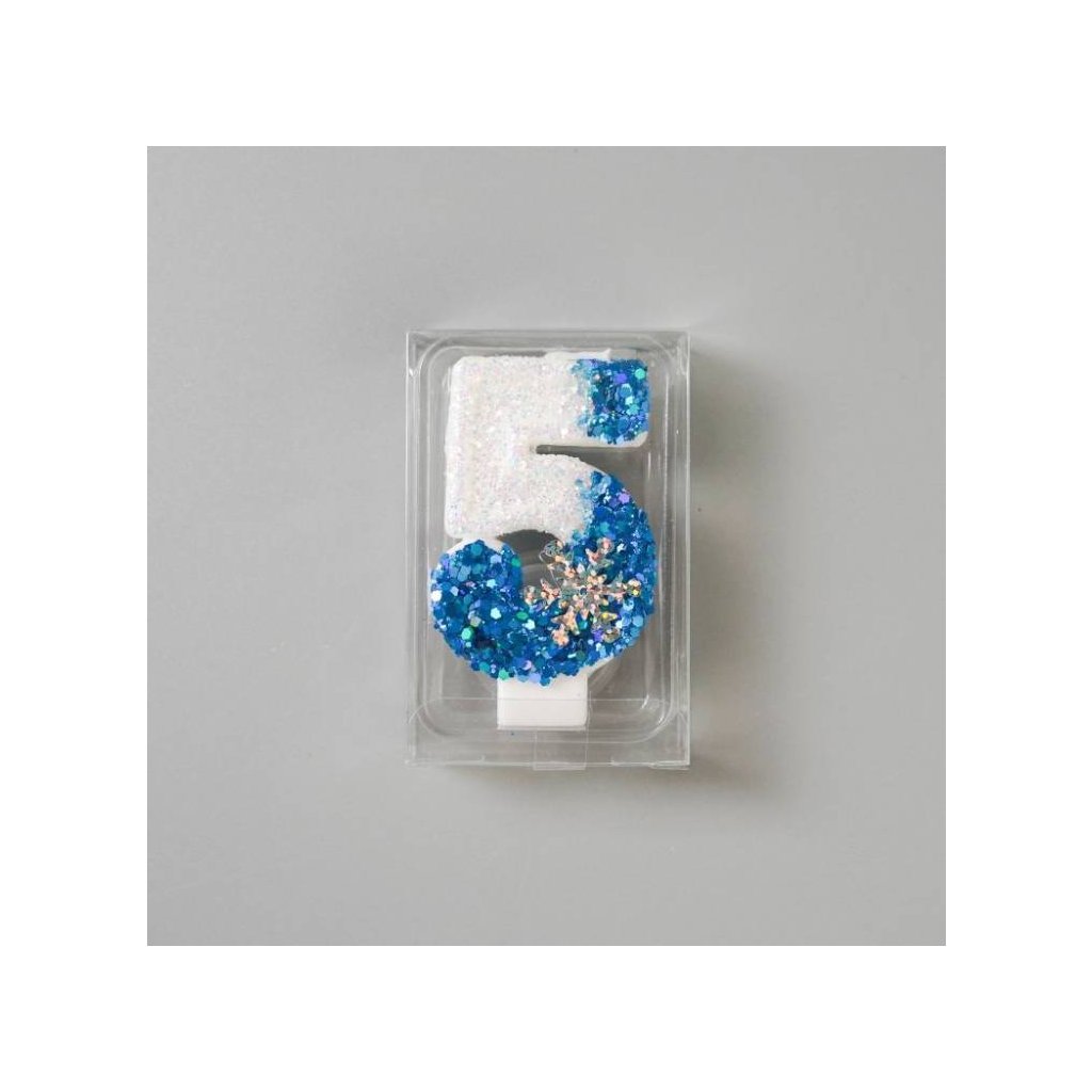 Svíčka bílo-modrá se sněhovou vločkou Frozen číslo 5 ▹