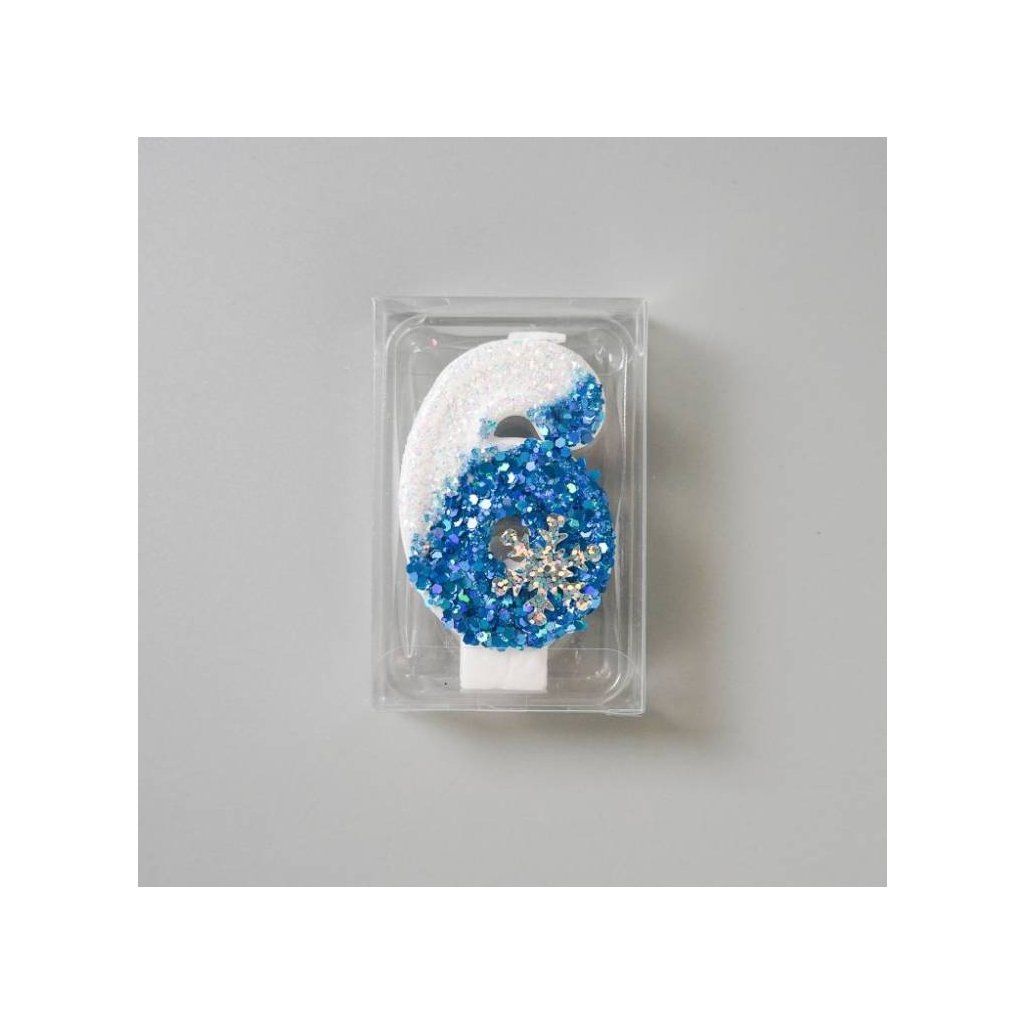 Svíčka Frozen bílo-modrá se sněhovou vločkou s číslem 6 ▹