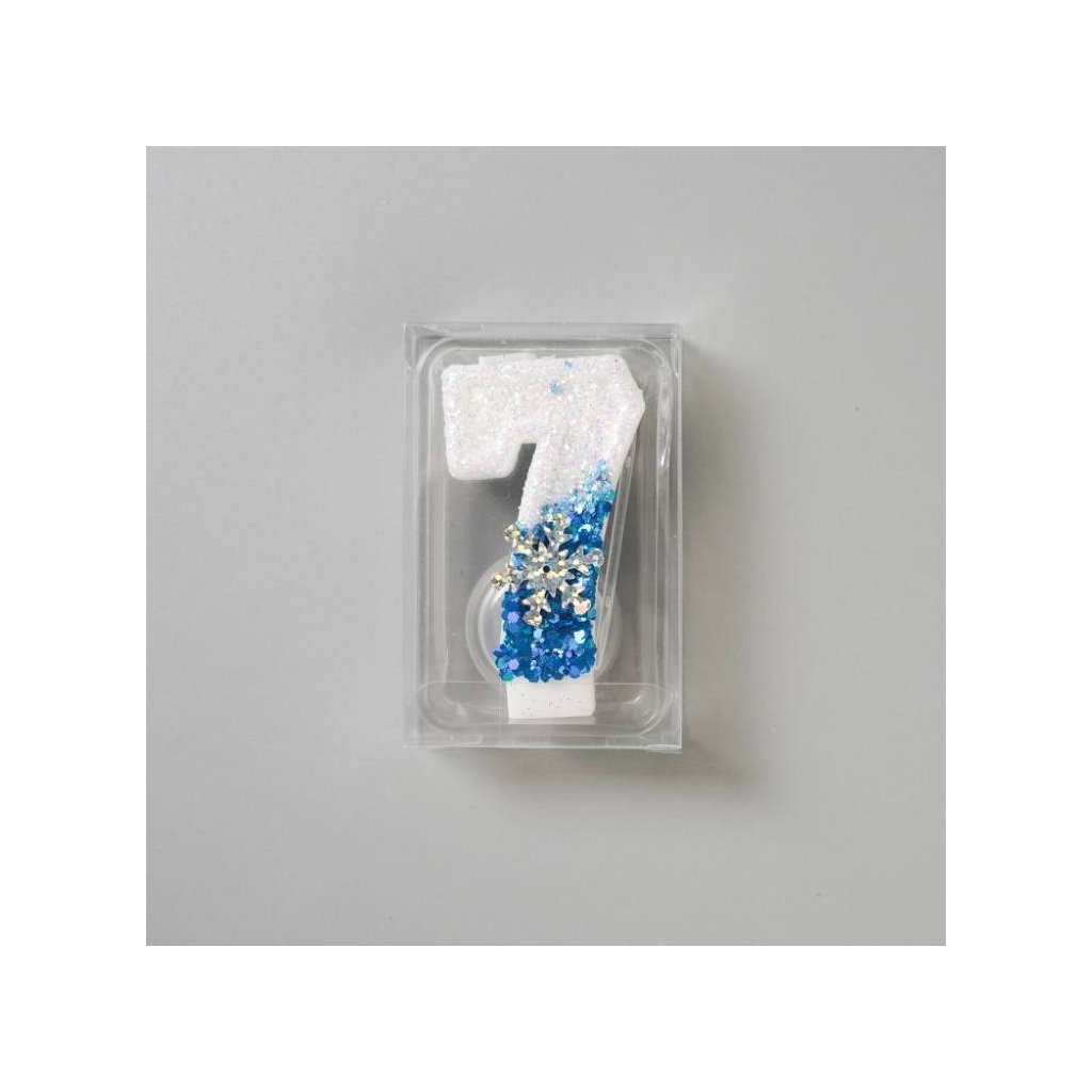 Svíčka bílo-modrá se sněhovou vločkou Frozen číslo 7 ▹