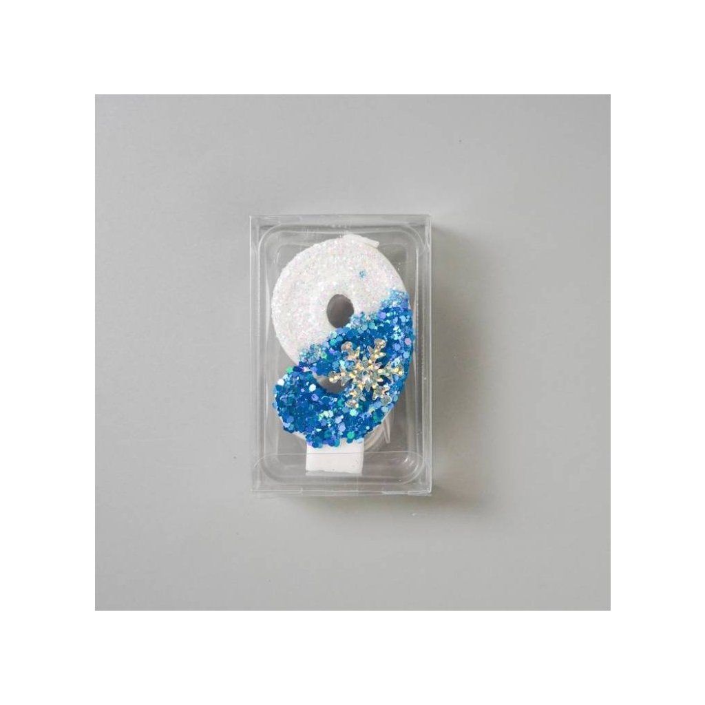 Svíčka Frozen bílo-modrá se sněhovou vločkou s číslem 9 ▹