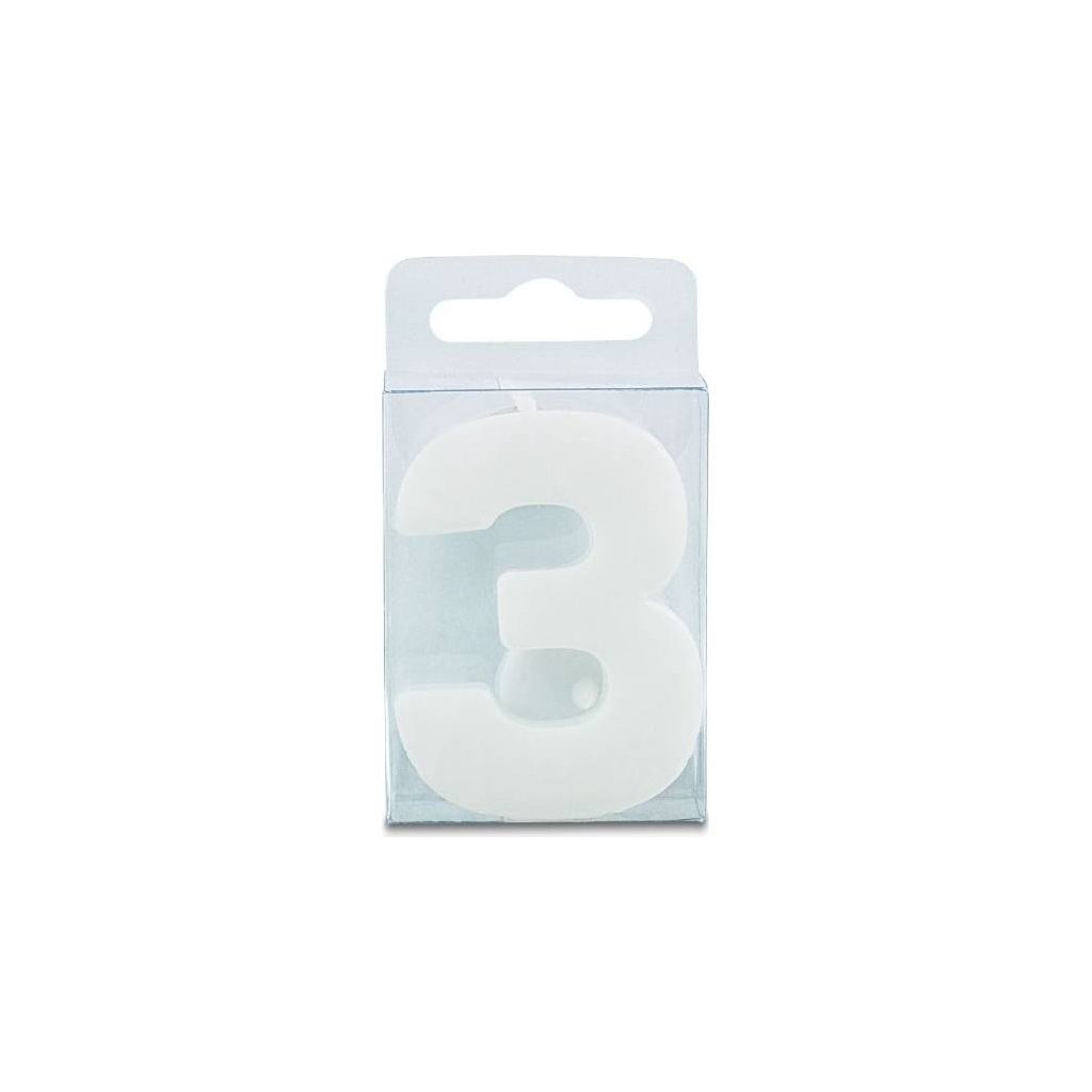 Svíčka ve tvaru číslice 3, výška 4 centimetry, bílá.Doplňkové parametry