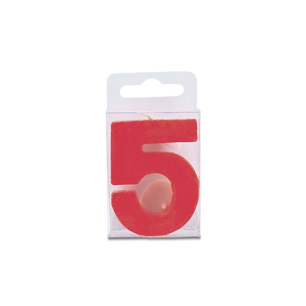 Svíčka ve tvaru číslice 5, výška 4 cm, červená barva. Je vhodná především na narozeninový dort a zdobení podobných moučníků.Doplňkové parametry