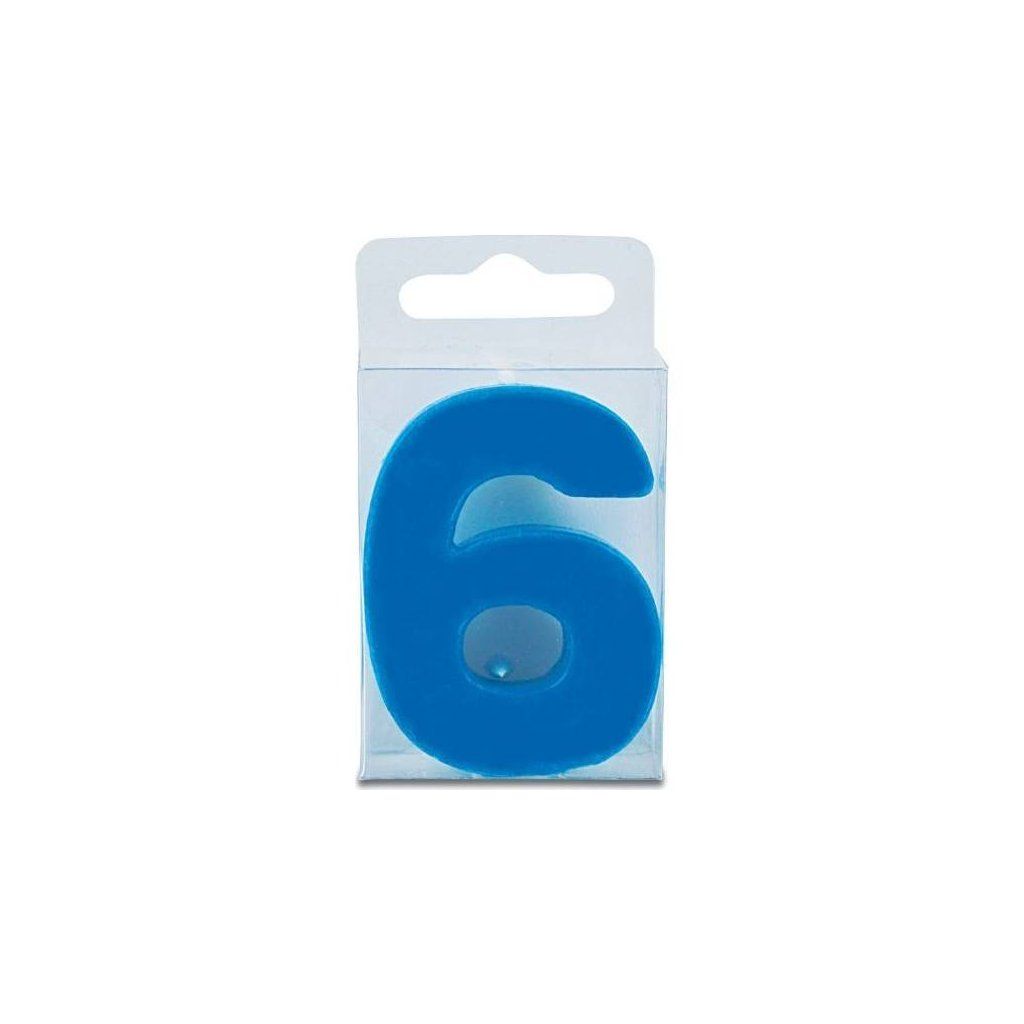 Svíčka modré barvy ve tvaru číslice 6, vysoká 4 centimetry.Doplňkové parametry