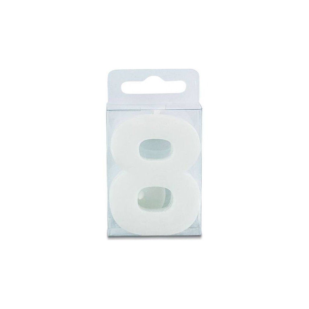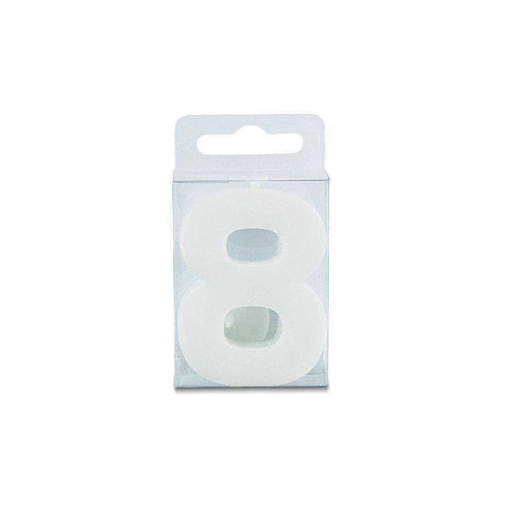Svíčka ve tvaru číslice 8, výška 4 cm, bílá. Je vhodná především na narozeninový dort a zdobení podobných moučníků.Doplňkové parametry
