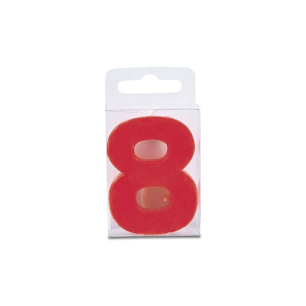 Svíčka ve tvaru číslice 8, výška 4 cm, červená barva. Je vhodná především na narozeninový dort a zdobení podobných moučníků.Doplňkové parametry
