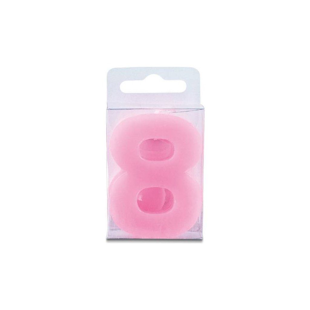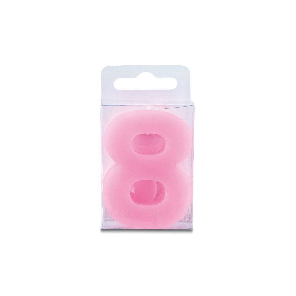 Svíčka ve tvaru číslice 8, růžová barva, výška 4 cm. Je vhodná především pro zdobení narozeninového dortu a podobných moučníků.Doplňkové parametry