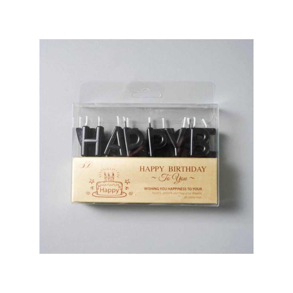 Narozeninové svíčky na dort ve tvaru nápisu Happy Birthday.