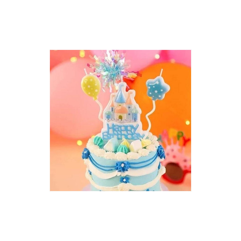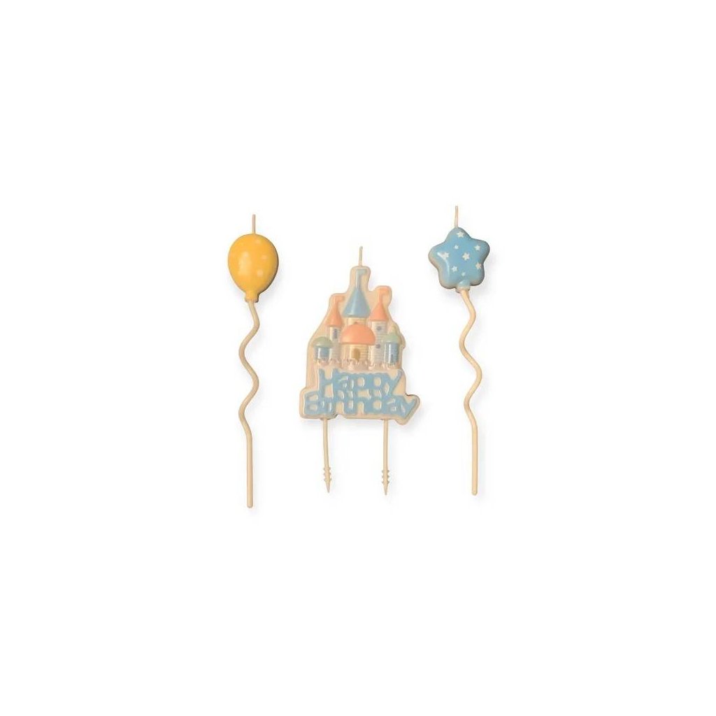 Dodejte narozeninovému dortu pohádkové kouzlo! Tato sada obsahuje svíčku s nápisem Happy Birthday doplněnou o zámek a dvě svíčky ve tvaru balónků. Vytváří krásnou, veselou dekoraci, která rozzáří každý dort. Výška zámku: 8 cm Výška balónků: 11 cmDoplňkové parametry